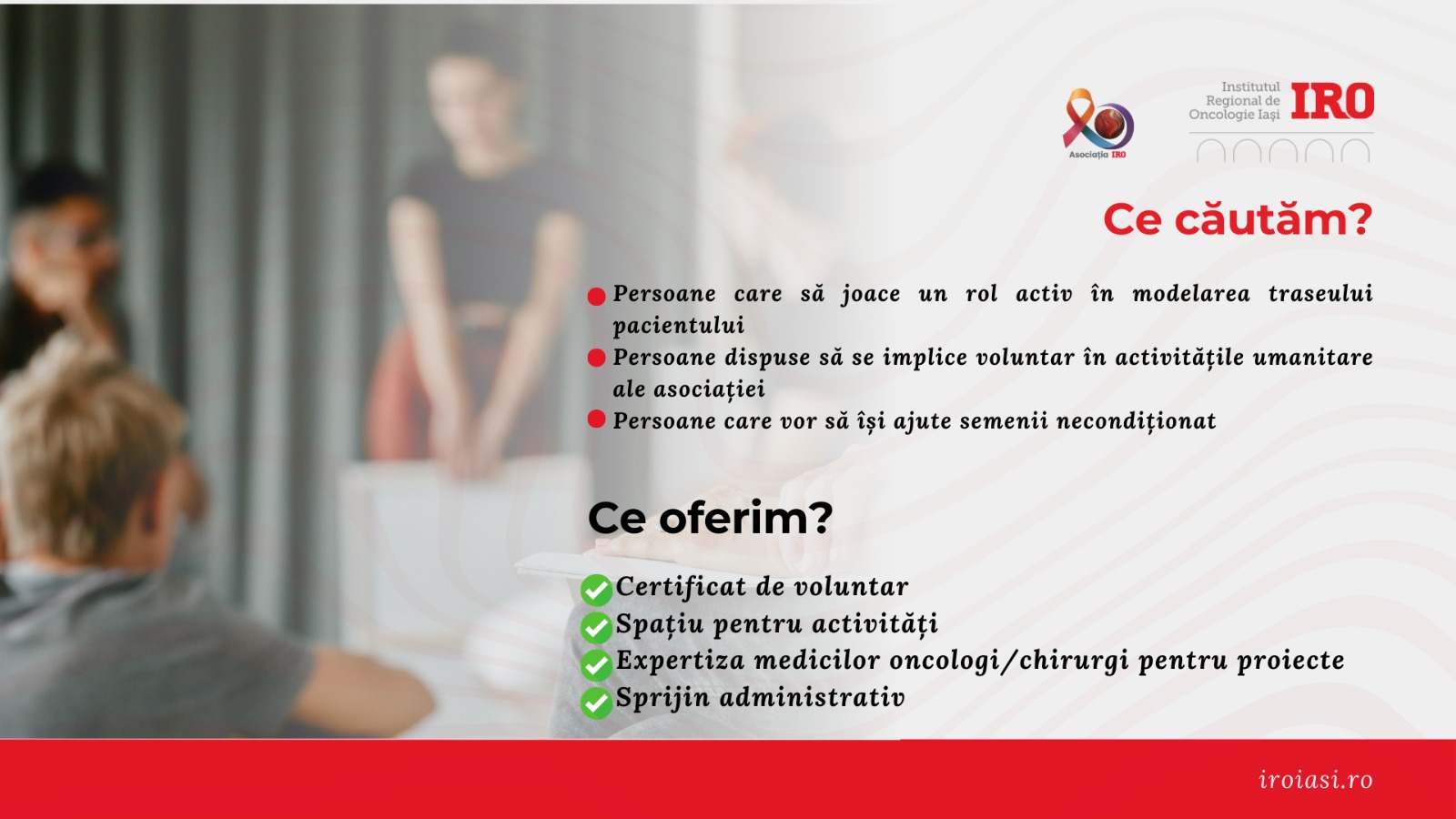 Grupul se întâlnește miercurea, din două în două săptămâni, între orele 17.00 și 19.00, la camera 6 de la parterul Centrului de Screening și Diagnostic în Boli Oncologice din strada Sărăriei, nr. 177 A. Informații și înscrieri la psiholog Claudia Borhan (0763 736 647) și la psiholog Lidia Stoica (0720655618). Detalii găsiți la https://www.iroiasi.ro/responsabilitate-sociala. În evidența IRO erau la finalul anului trecut 20.017 pacienți, cei mai mulți fiind diagnosticați cu cancer mamar (4.209), colorectal (3.457) și de prostată (1.978).