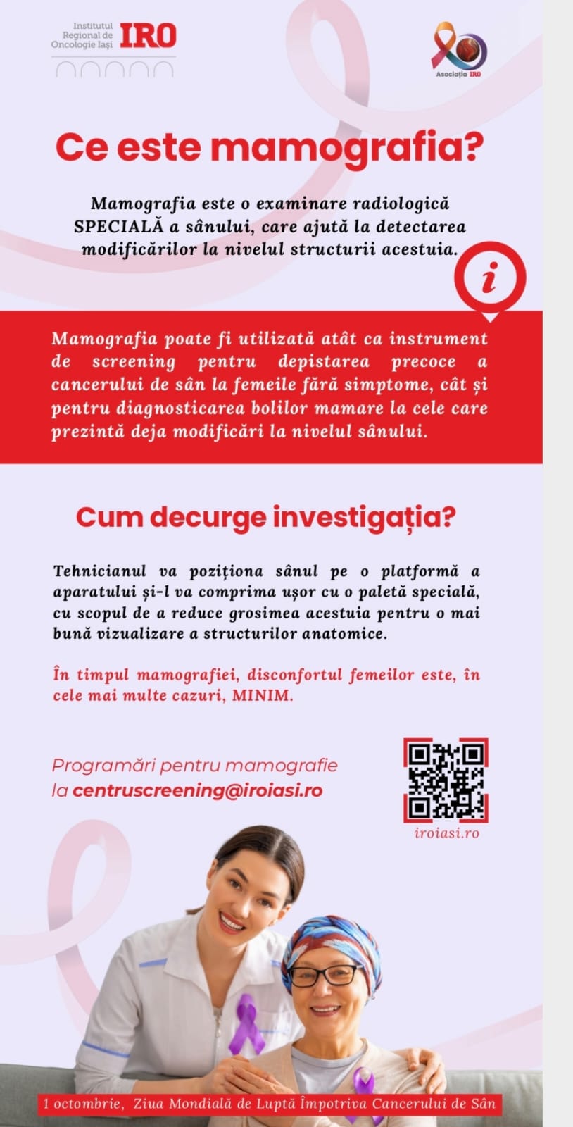 În acest moment, se pot efectua mamografii la Centrul de Screening și Diagnostic în Boli Oncologice al IRO Iași, cu bilet de trimitere, în baza serviciilor contractate cu Casa de Asigurări, în baza unei programări prealabile, la centruscreening@iroiasi.ro.