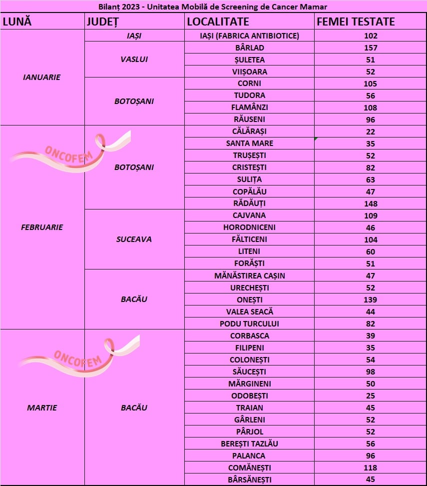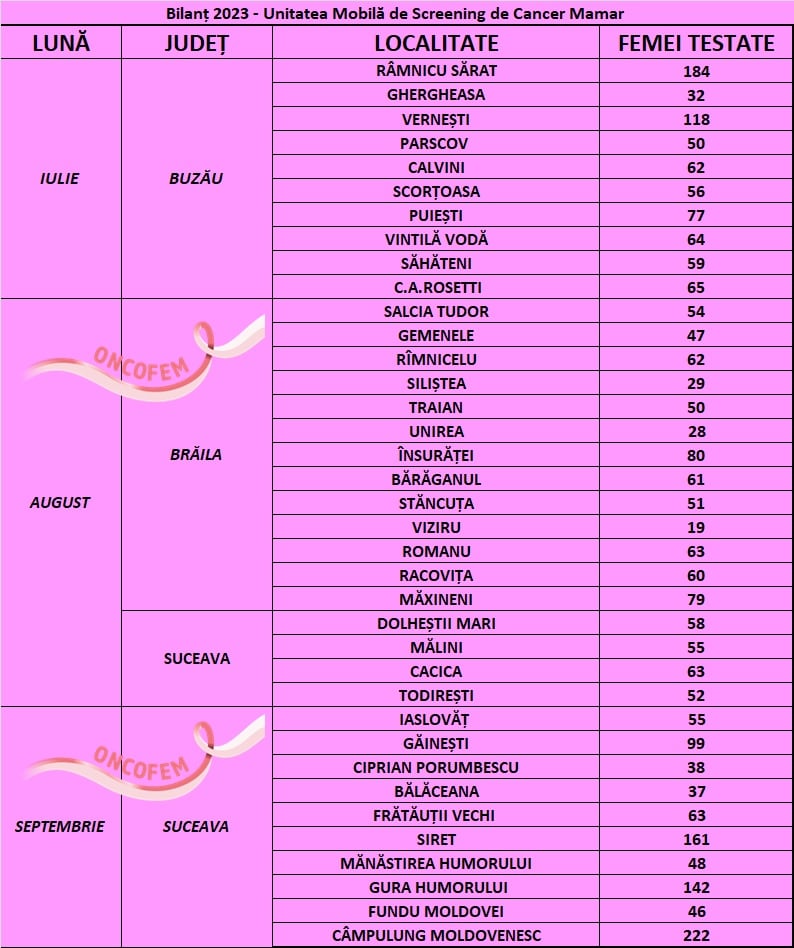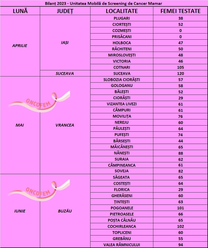 Unitatea Mobilă de Screening de Cancer Mamar, dotată cu mamograf digital, a continuat deplasările și în 2023, când a străbătut 128 de localități din nord estul și sud estul țării. Peste 8.800 de femei asigurate și neasigurate s-au testat gratuit la unitatea mobilă în acest an, în cadrul proiectului “ONCOFEM - Fii responsabilă de sănătatea ta! Prevenție, depistare, diagnostic și tratament precoce al cancerului de sân”.